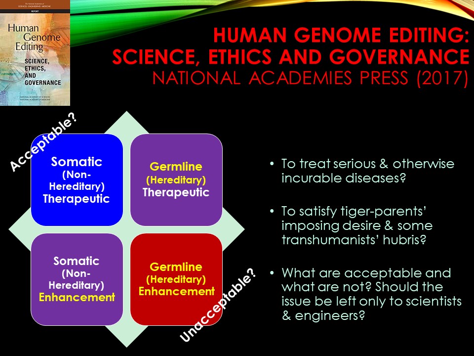 美國國家科學院及醫學院聯同英國皇家學院在2020年出版的報告 ‘’Heritable Human Genome Editing‘’,為往後基因組編輯臨床應用的進程建議了一個較謹慎的路線圖。該報告可從以上學院網站免費下載。亦歡迎大家登入以下網頁,觀看其他短片,思考有關議題。